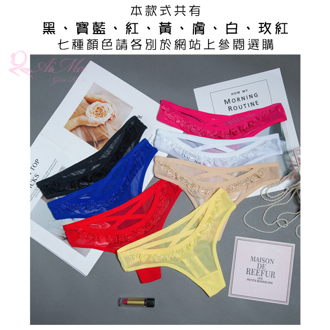 溫柔暗號!前交叉細帶滾邊蕾絲網紗中腰T字褲﹝紅﹞