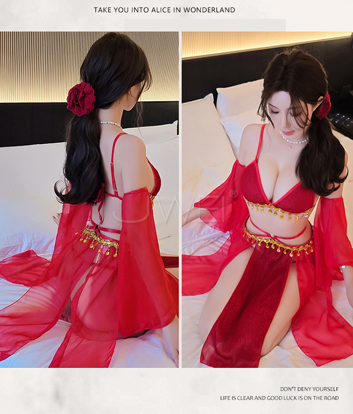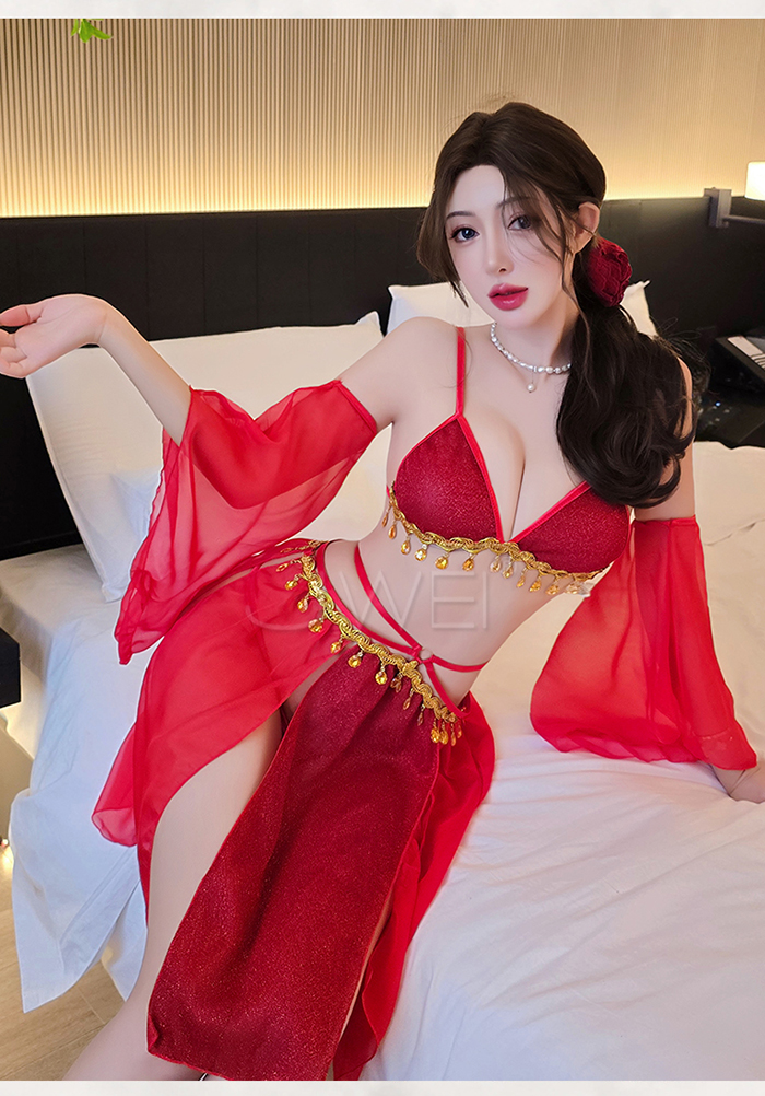 | 情定西域.異域風情復古亮片拼接裙擺角色扮演服-紅色【胸罩+短裙+T褲+袖子*2】