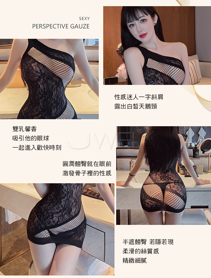 | 魅惑乳香.斜肩鏤空露乳半遮蜜桃包臀網衣-黑色【單件網衣+黑色網眼手套】