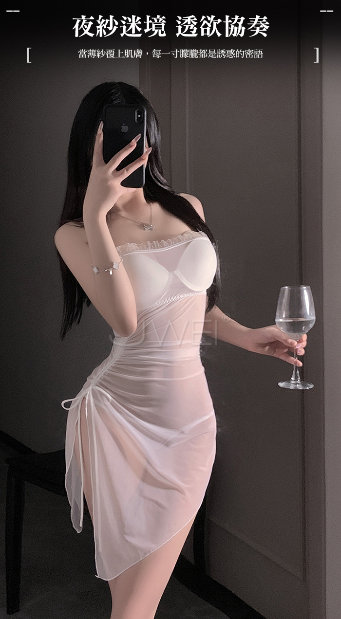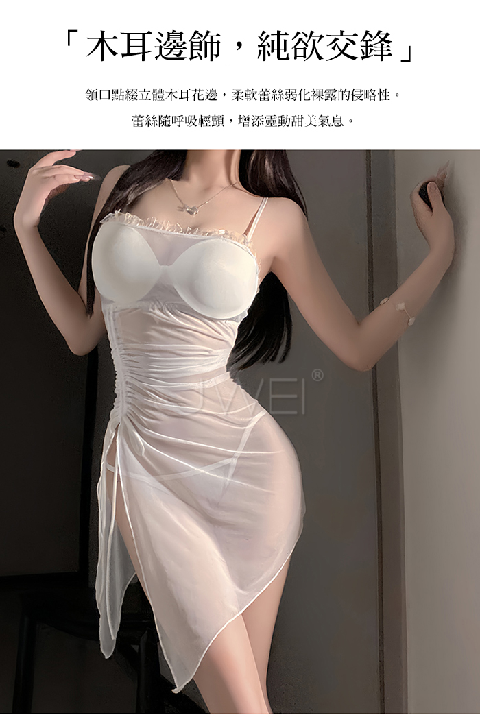 | 夜紗迷境.韻味透紗木耳邊飾側開衩抽褶收腰睡裙【睡裙+T褲-白色】