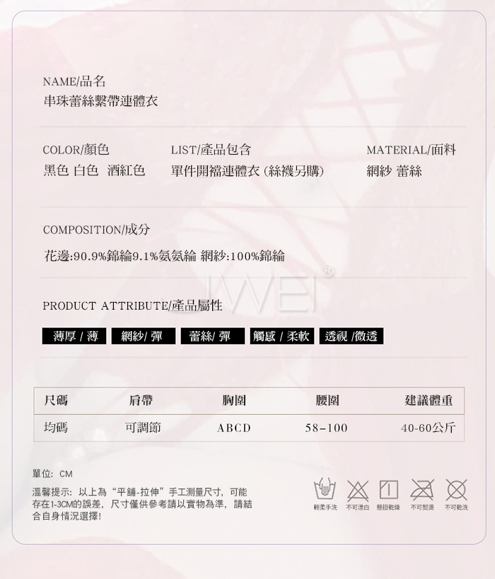 ■內容物:單件連體衣 ■適穿尺寸:FREESIZE ■彈性:彈 ■未撐開平量尺寸正負誤差1~2cm,1吋=2.54cm ■注意事項:基於保障消費者個人衛生,此貼身衣物恕不接受退換貨。 (如為商品本身暇疵,接受七日內換貨,請勿試穿,謝謝您)
